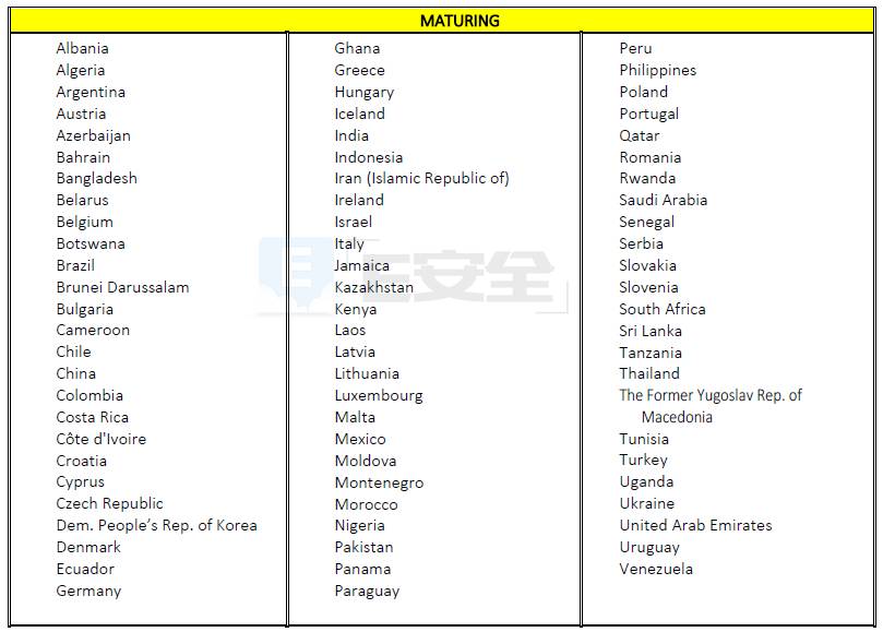成熟阶段:共有77个国家做出了复杂的网络安全承诺,并采取网络安全计划和举措。