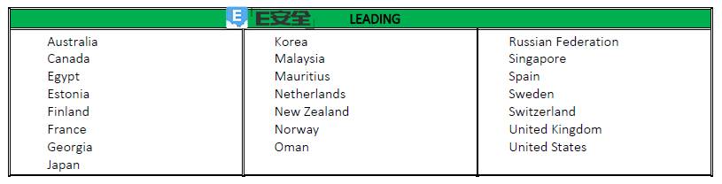 领先阶段:共有21个国家在五大考核因素中得分较高。