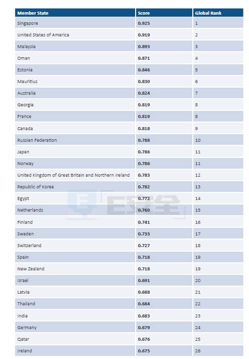 报告数据显示,排名前十的国家包括新加坡、美国、马来西亚、阿曼、爱沙尼亚、毛里求斯、澳大利亚、格鲁吉亚和法国(并列排名第8)、加拿大、俄罗斯。日本和挪威并列排名第11,韩国排名第13,以色列排名第20、泰国第22,印度第23,德国第24,中国第32。