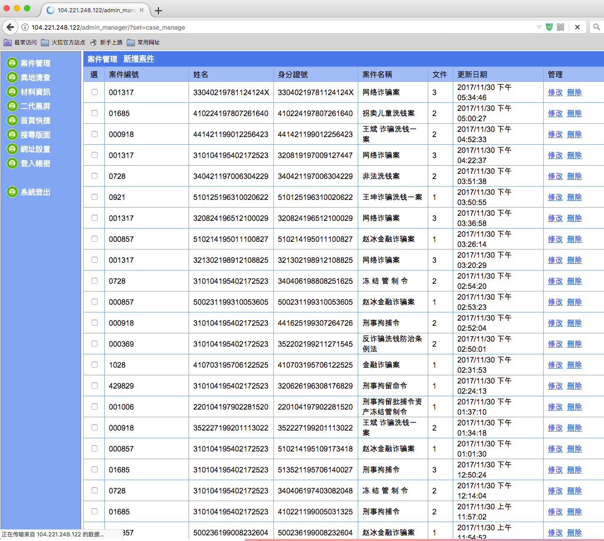 此类仿冒网站可以实施较为精准的诈骗,是因为此类网站后台存有由诈骗分子提前预置的大量潜在受害用户的“案件编号”、姓名、身份证号、“案件名称”等多类信息,如图6所示。