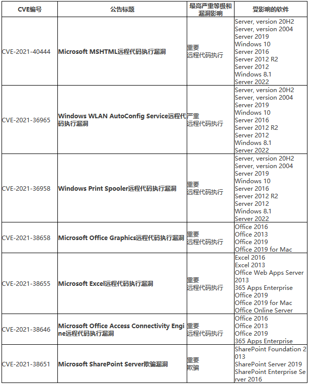 9月14日,微软发布了2021年9月份的月度例行安全公告,修复了其多款产品存在的85个安全漏洞。受影响的产品包括:Windows 10 21H1 & Windows Server v21H1(33个)、Windows 10 20H2 & Windows Server v20H2(33个)、Windows 10 2004 & Windows Server v2004(33个)、Windows 8.1 & Server 2012 R2(25个)、Windows Server 2012(23个)、Windows RT 8.1(25个)和Microsoft Office-related software(9个)。